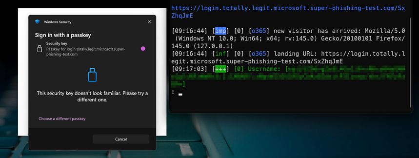 Bij inloggen met een passkey was het resultaat anders. De passkey herkende de phishingpagina niet als het legitieme domein en blokkeerde de inlogpoging. Zelfs wanneer een gebruiker de aanval niet opmerkt, voorkomt de technologie dat het account gecompromitteerd raakt: